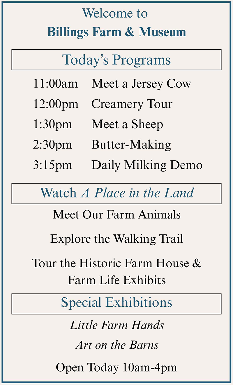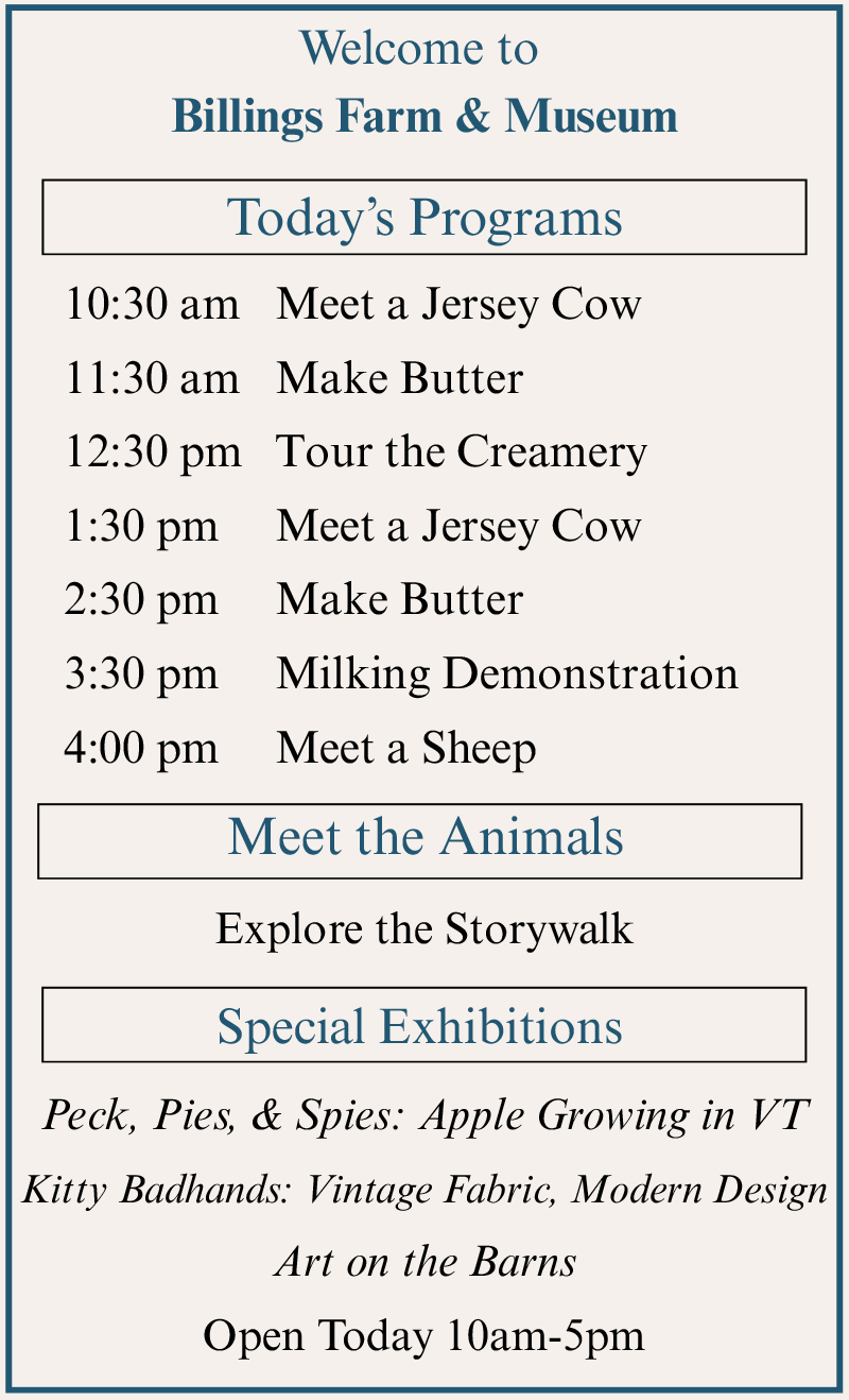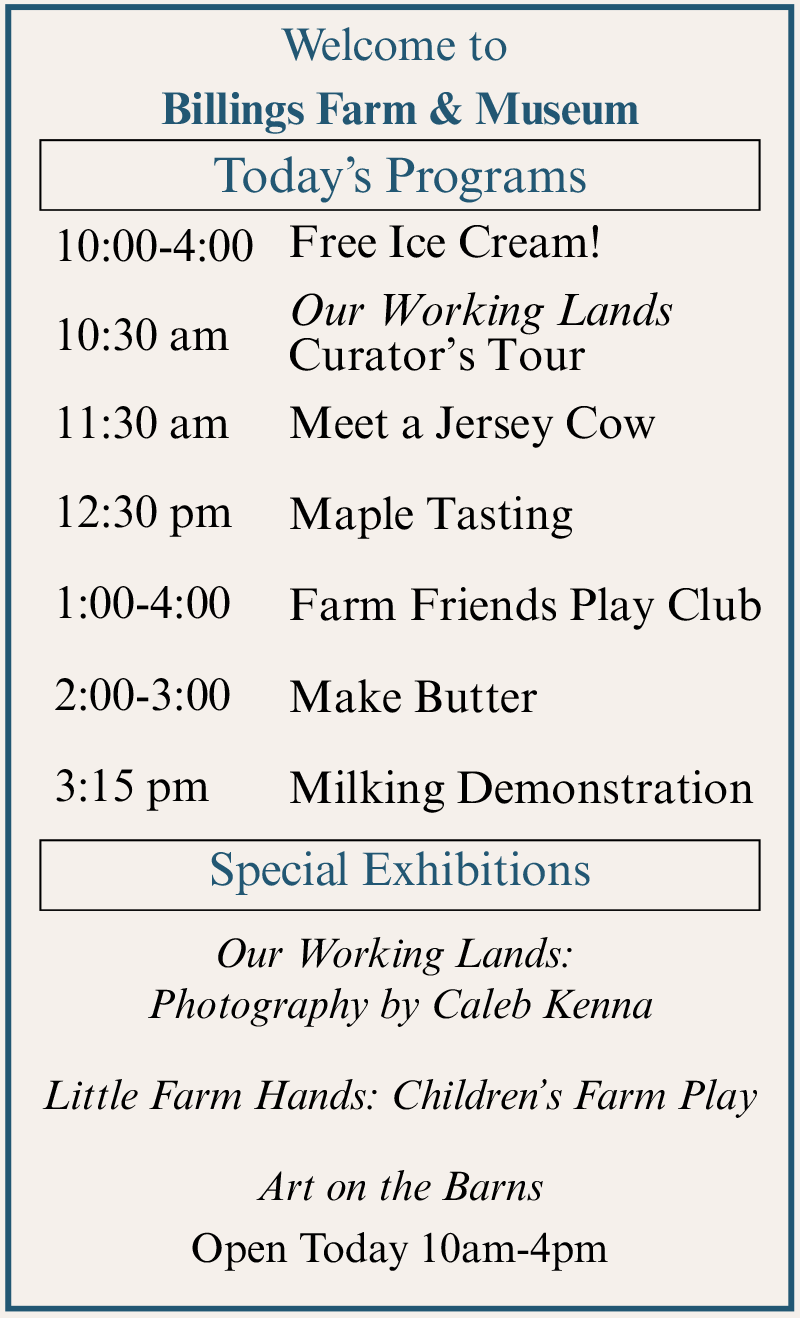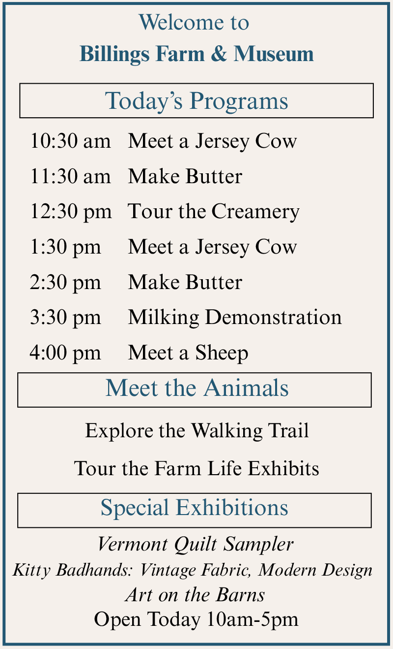 Billings Farm & Museum is just a scenic stroll from the village center of Woodstock, Vermont, and is regarded as one of the finest outdoor history museums in the country. Combining a fully-operating Jersey dairy farm with educational exhibits and interactive programs and events, Billings Farm & Museum is committed to providing education and enjoyment to visitors of all ages.