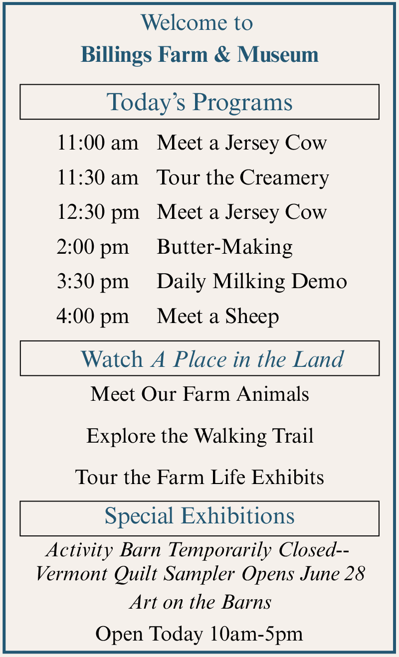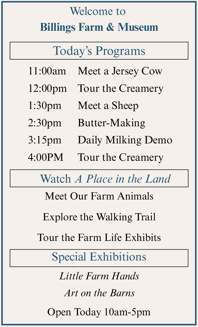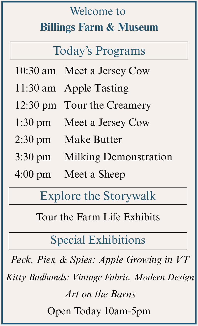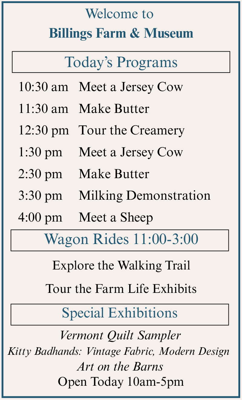 Billings Farm & Museum is just a scenic stroll from the village center of Woodstock, Vermont, and is regarded as one of the finest outdoor history museums in the country. Combining a fully-operating Jersey dairy farm with educational exhibits and interactive programs and events, Billings Farm & Museum is committed to providing education and enjoyment to visitors of all ages.