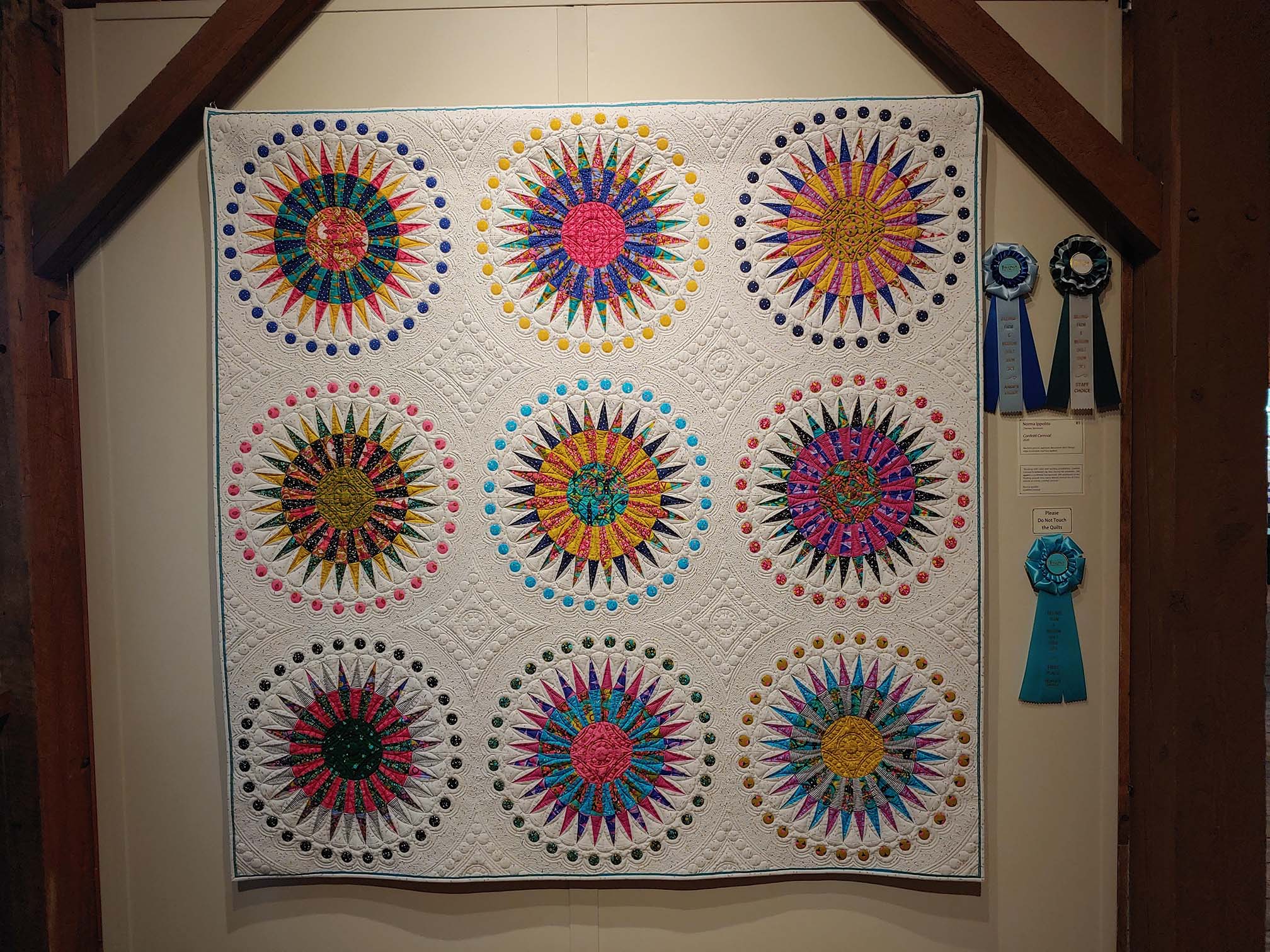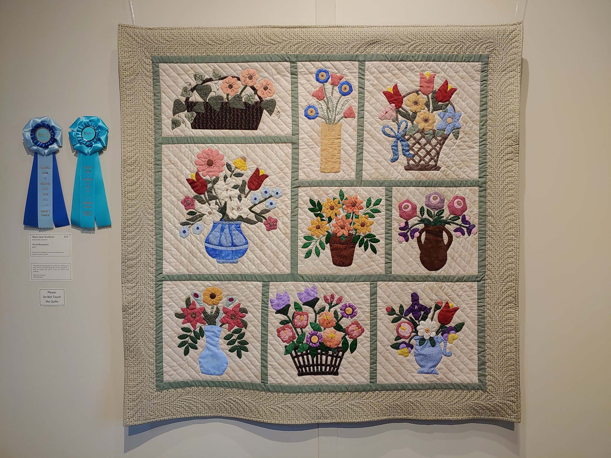 At the exhibition opening, the Jurors’ Choice Awards were presented to Linda Diak of Chester, Vermont for her quilt, Berkeley, by juror Marti DelNevo; Floral Bouquets made by Mary Jane Arvidson of Brownsville, VT, was selected by juror Nola Forbes; Norma Ippolito of Chester, VT, was selected by juror Froncie Quinn for her quilt, Confetti Carnival, which also received the Billings Farm & Museum Staff Choice Award.
