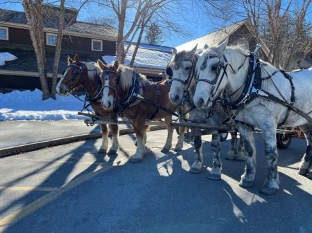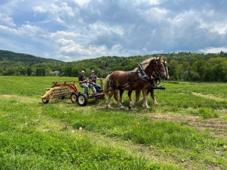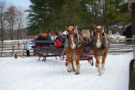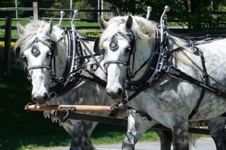 Today, our horses primarily pull ride wagons and sleighs and are trained to pull farm equipment too. At Billings Farm, we have four draft horses. Luke and Danny, born in 2012, are a team of Percherons, and Jim and Jerry, born in 2018, are a team of Belgians. Percheron horses are known for their strength and stamina while Belgians are known for their power and endurance. These attributes provide the farm with a sustainable and economical option for performing heavy labor tasks that keep the farm running, all while simultaneously connecting us to our agricultural past.