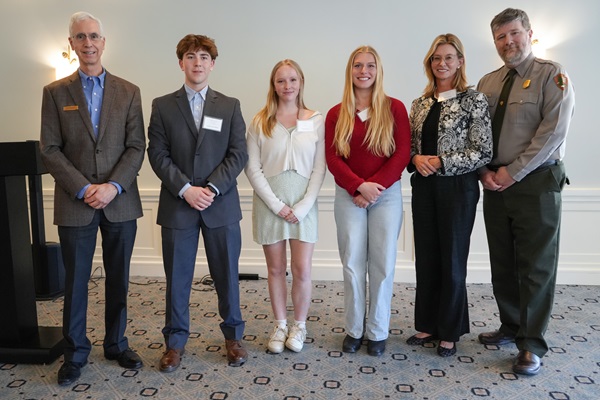 From left to right: David Simmons, President, The Woodstock Foundation and Executive Director, Billings Farm & Museum; Joaquin Jones-Welker, first place awardee; Maggie Knox, second place awardee; Jane Stout, third place awardee; Rachel French Weber, Trustee, The Woodstock Foundation; and Rick Kendall, Superintendent, Marsh-Billings-Rockefeller National Historical Park.
