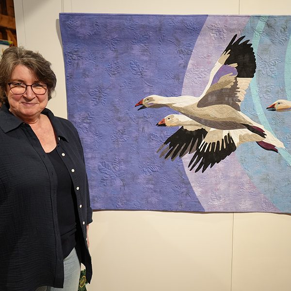 Inspired by Neil Young’s lyrics in Helpless, “big birds flying across the skies, throwing shadows on our eyes,” Diak’s quilt blends serenity and tension. The elegant flight of geese and soft colors contrast with chaotic, swirling maple leaves. “By the time I put this piece on the longarm, Canada- our neighbor, our friend – was under senseless attack by our government,” she said.